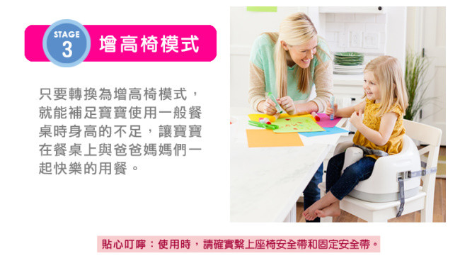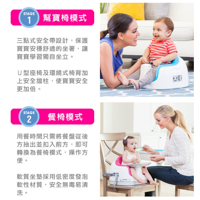 三合一模◎三點式安全帶設計,保護寶寶安穩舒適的坐姿|◎U型座椅及環繞是椅背和安全擋柱設計,安全更加倍|◎增高模式,讓寶寶餐與一起用餐的樂趣|材質:座椅-Polyurethane(聚氨酯-發泡PU)、增高底座-聚丙烯(PP)、餐盤-ABS<br/>幫寶椅尺寸:W35xL39xH25.5cm<br/>增高椅尺寸:W35xL39xH29cm<br/>商品重量:1.9kg<br/>適用年齡:6個月~3歲<br/>產地:,