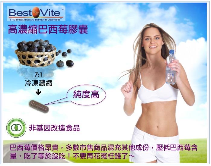 效期至2018年7月◎高ORAC營養價值,水果中的藍寶石|◎冷凍乾燥濃縮,保存活性成份|◎不含基因改造成分 GOM-FREE|◎品名:【美國BestVite】必賜力高濃縮巴西莓膠囊買一送一<br/>◎內容物成份:高濃縮巴西莓525毫克<br/>◎內容量:本包裝共含120份<br/>◎熱量:0大卡<br/>◎每份營養成份:高濃縮巴西莓525毫克<br/>◎食品添加物名稱:羥丙基甲基纖維素<br/>◎產地:美國原裝進口<br/>◎保存期限:3年<br/>◎製造/有效日期:如瓶身所示<br/>◎投保責任險:國泰產品責任險1000萬元,